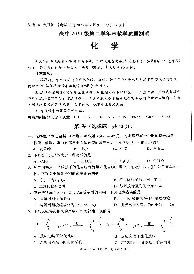 四川省绵阳市高中2024届下学期期末教学质量测试化学
