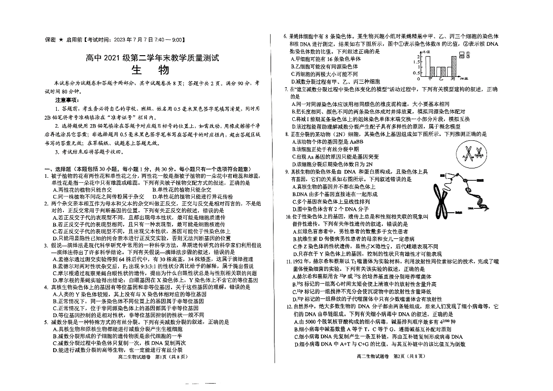 四川省绵阳市高中2024届下学期期末教学质量测试生物