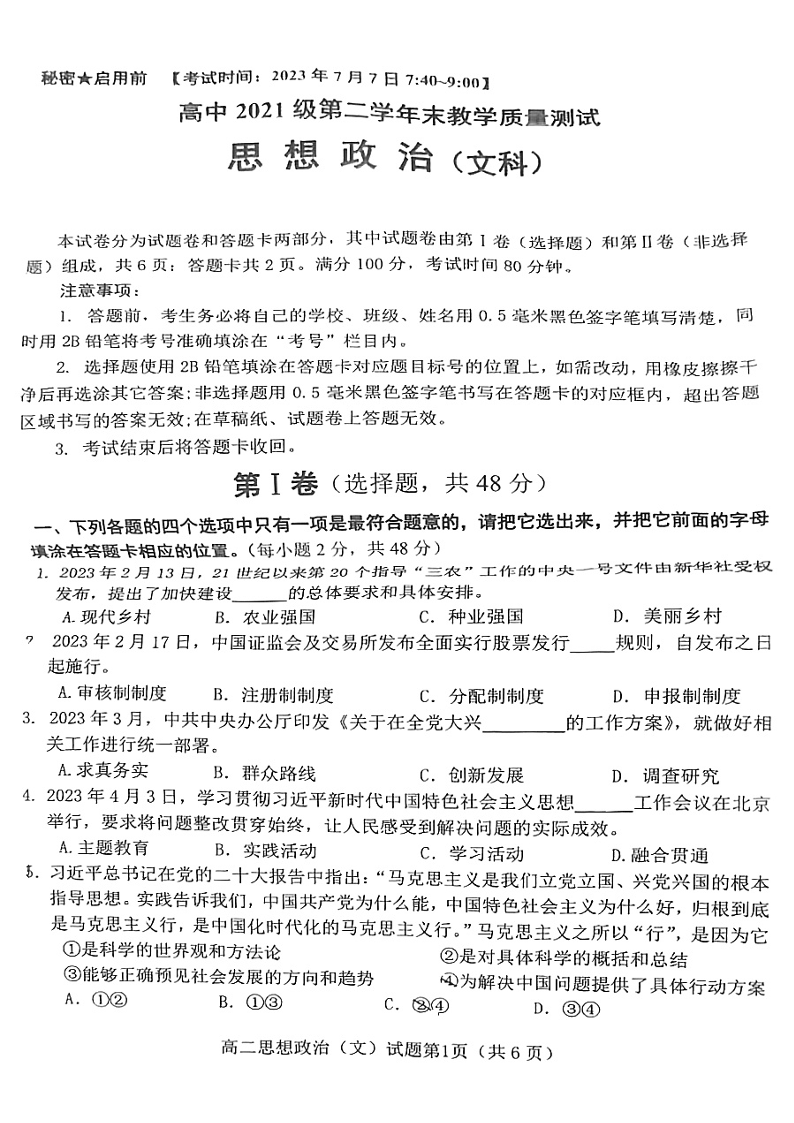 四川省绵阳市高中2024届下学期期末教学质量测试政治