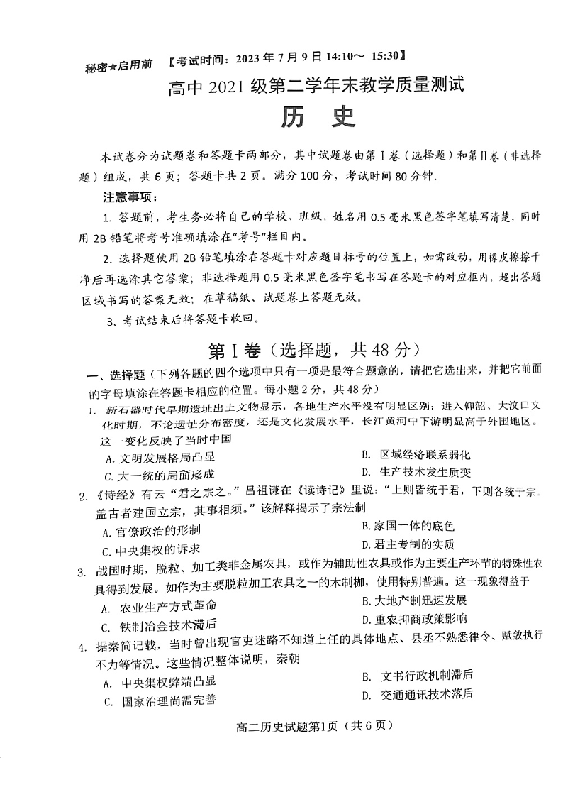 四川省绵阳市高中2024届下学期期末教学质量测试历史