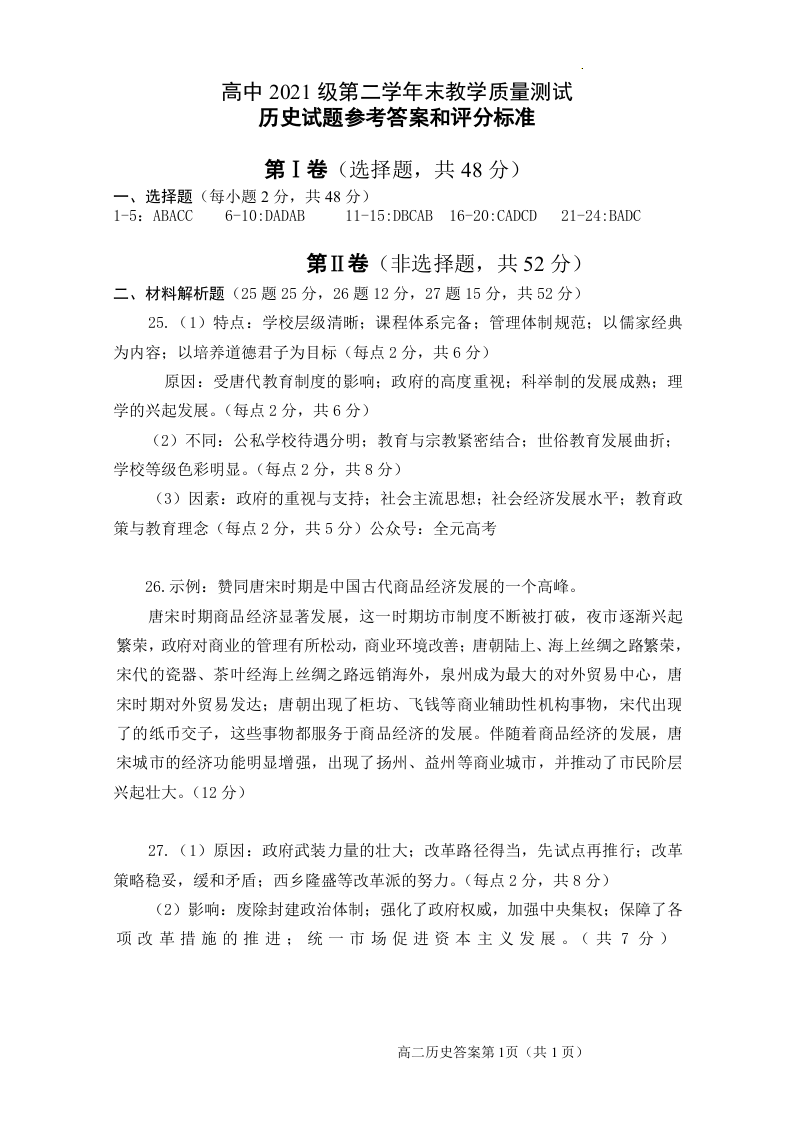 四川省绵阳市高中2024届下学期期末教学质量测试历史答案