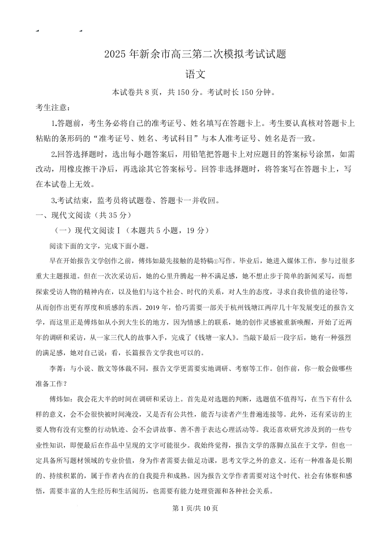 江西省新余市2025届高三下学期第二次模拟考试(新余二模)语文(原卷版)