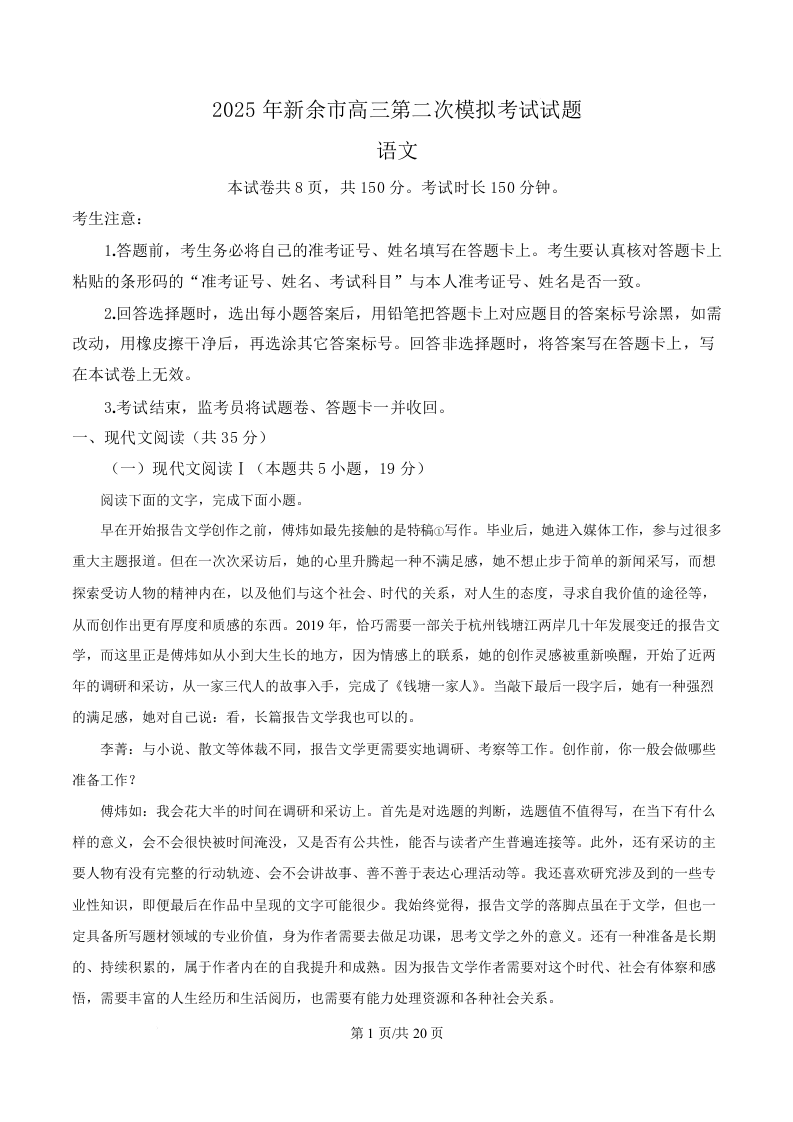 江西省新余市2025届高三下学期第二次模拟考试(新余二模)语文(精品解析版)