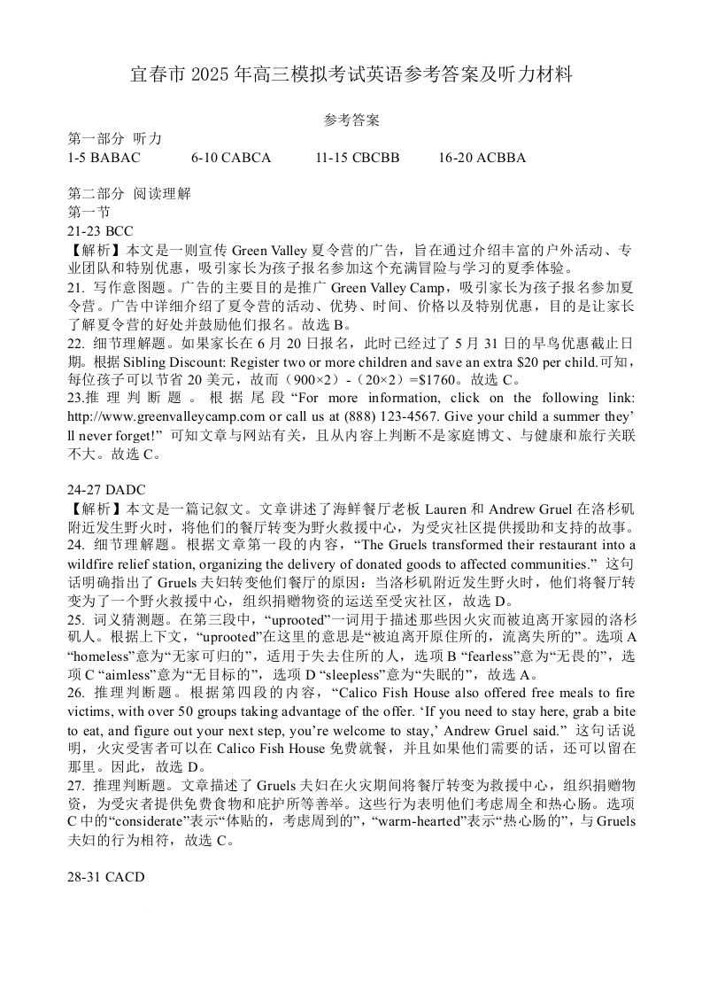 江西省宜春市2025届高三下学期4月模拟考试(宜春二模)英语答案