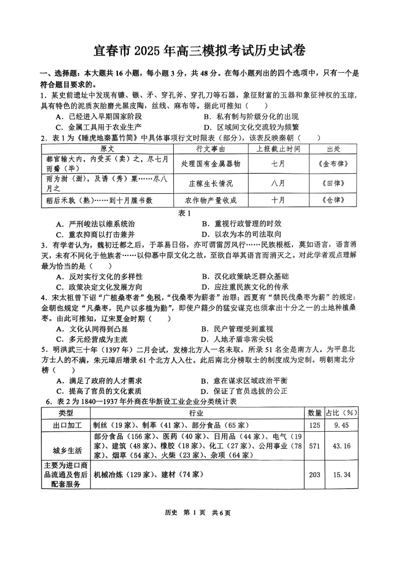 江西省宜春市2025届高三下学期4月模拟考试(宜春二模)历史+答案