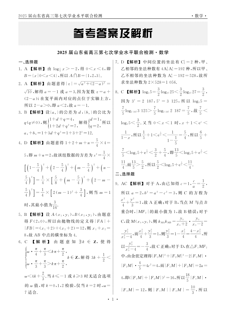 山东省齐鲁名校大联考2025届高三第七次学业水平联合检测数学答案