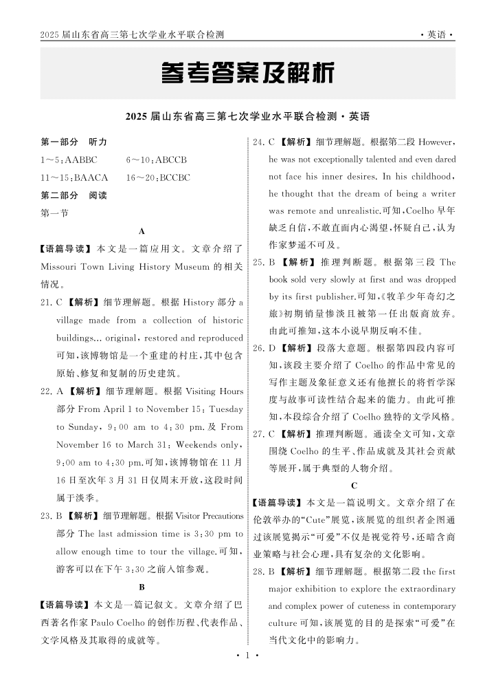 山东省齐鲁名校大联考2025届高三第七次学业水平联合检测英语答案