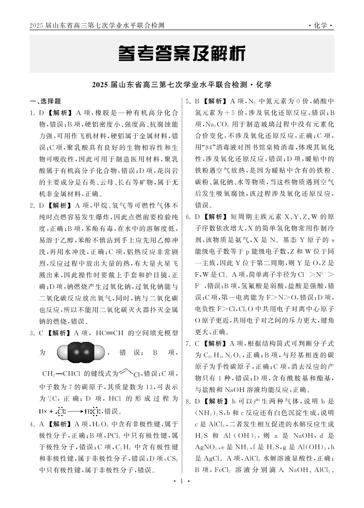 山东省齐鲁名校大联考2025届高三第七次学业水平联合检测化学答案