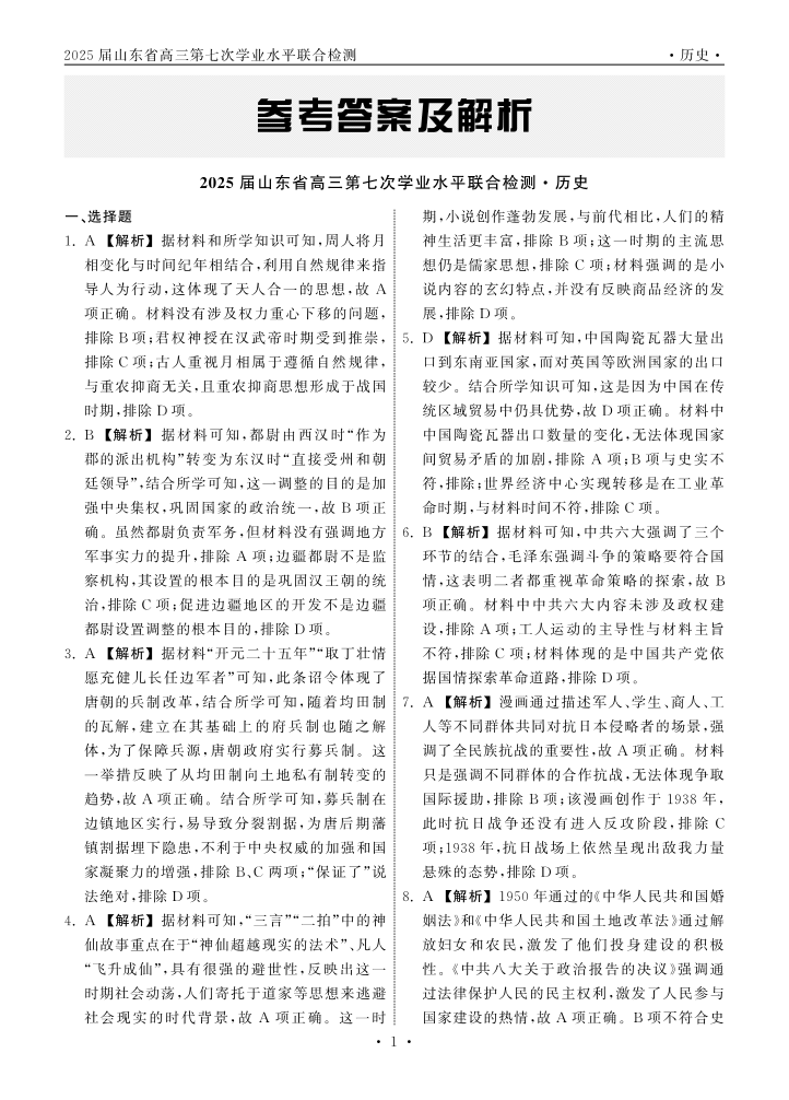 山东省齐鲁名校大联考2025届高三第七次学业水平联合检测历史答案