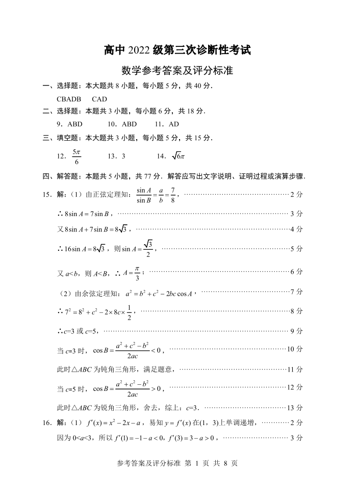 四川省元三维大联考·高2022级第三次诊断性测试(绵阳三诊B卷)数学答案