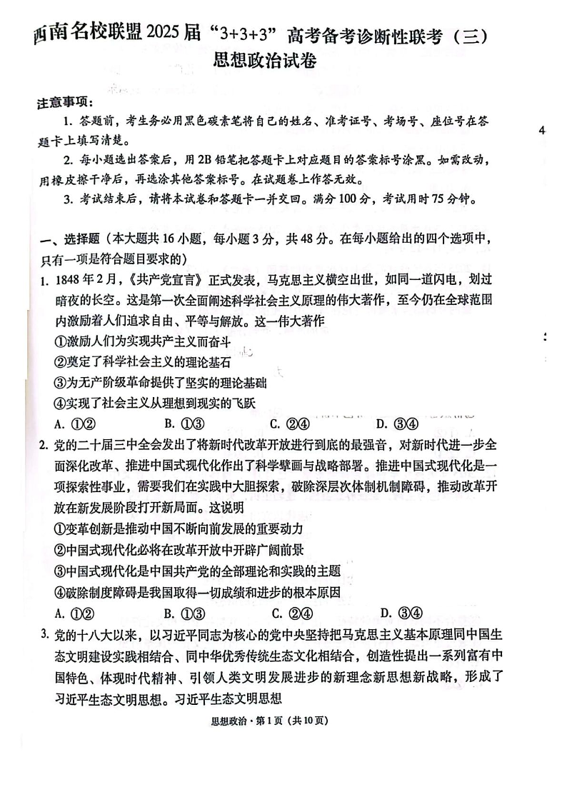 西南名校联盟2025届高三下学期“3+3+3”高考备考诊断性联考(三)政治