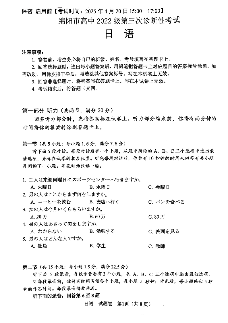 四川省绵阳市高中2022级第三次诊断性考试(绵阳三诊A卷)日语