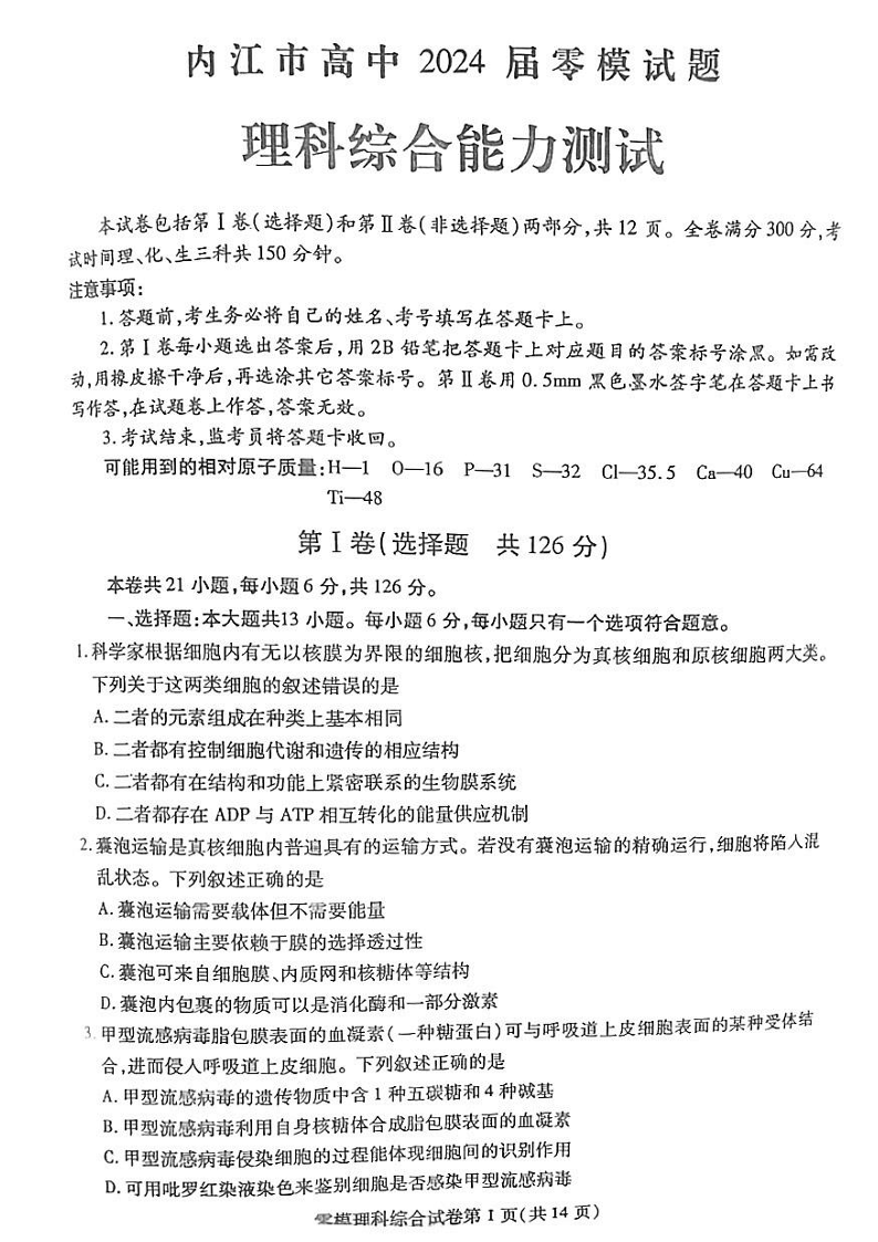 四川省内江市2024届高三零模考试理综
