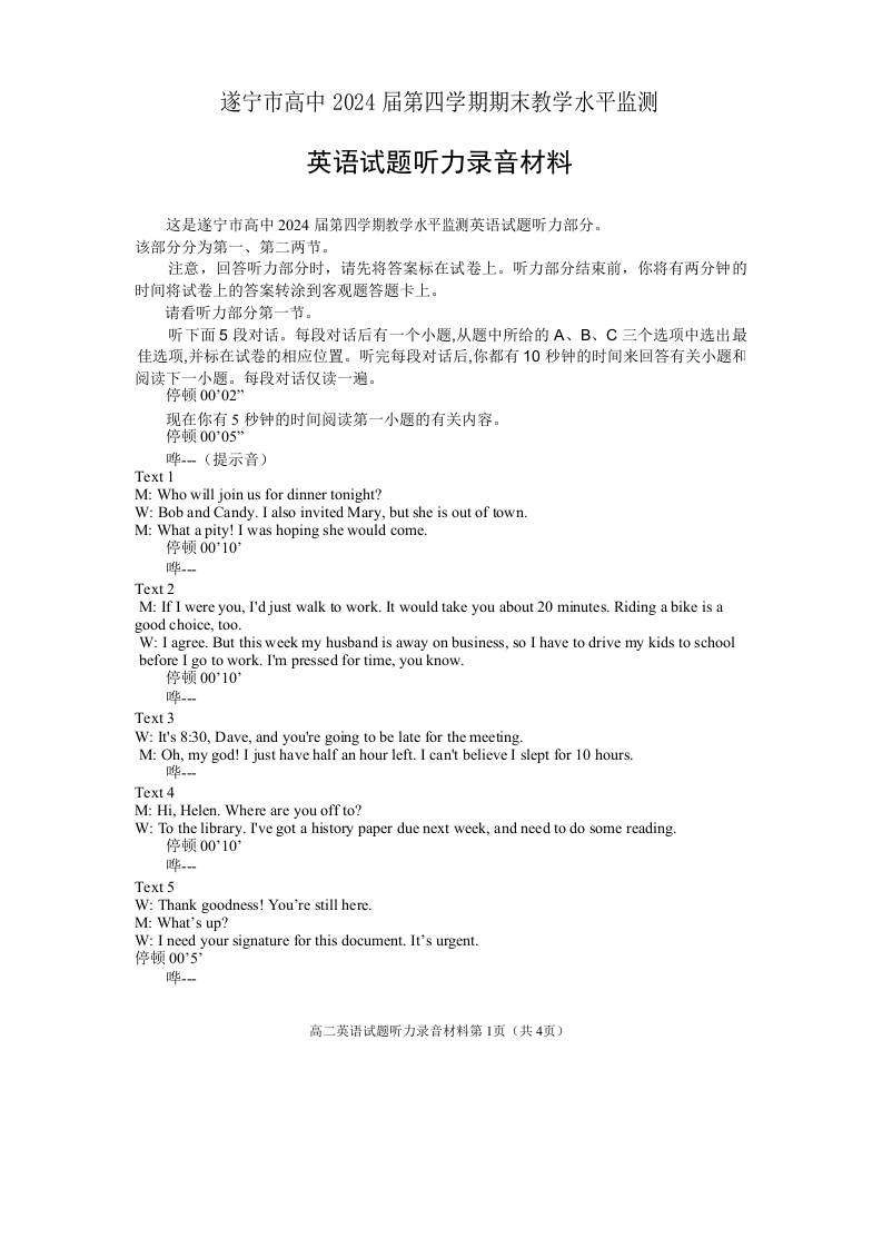 四川省遂宁市2024届下学期期末监测英语听力答案