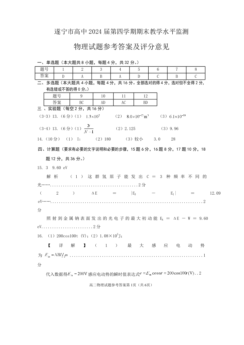 四川省遂宁市2024届下学期期末监测物理答案