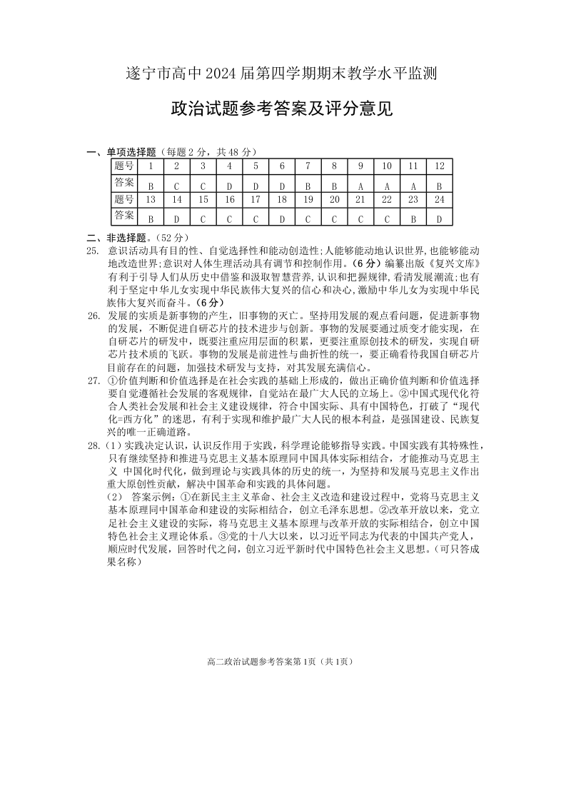 四川省遂宁市2024届下学期期末监测政治答案