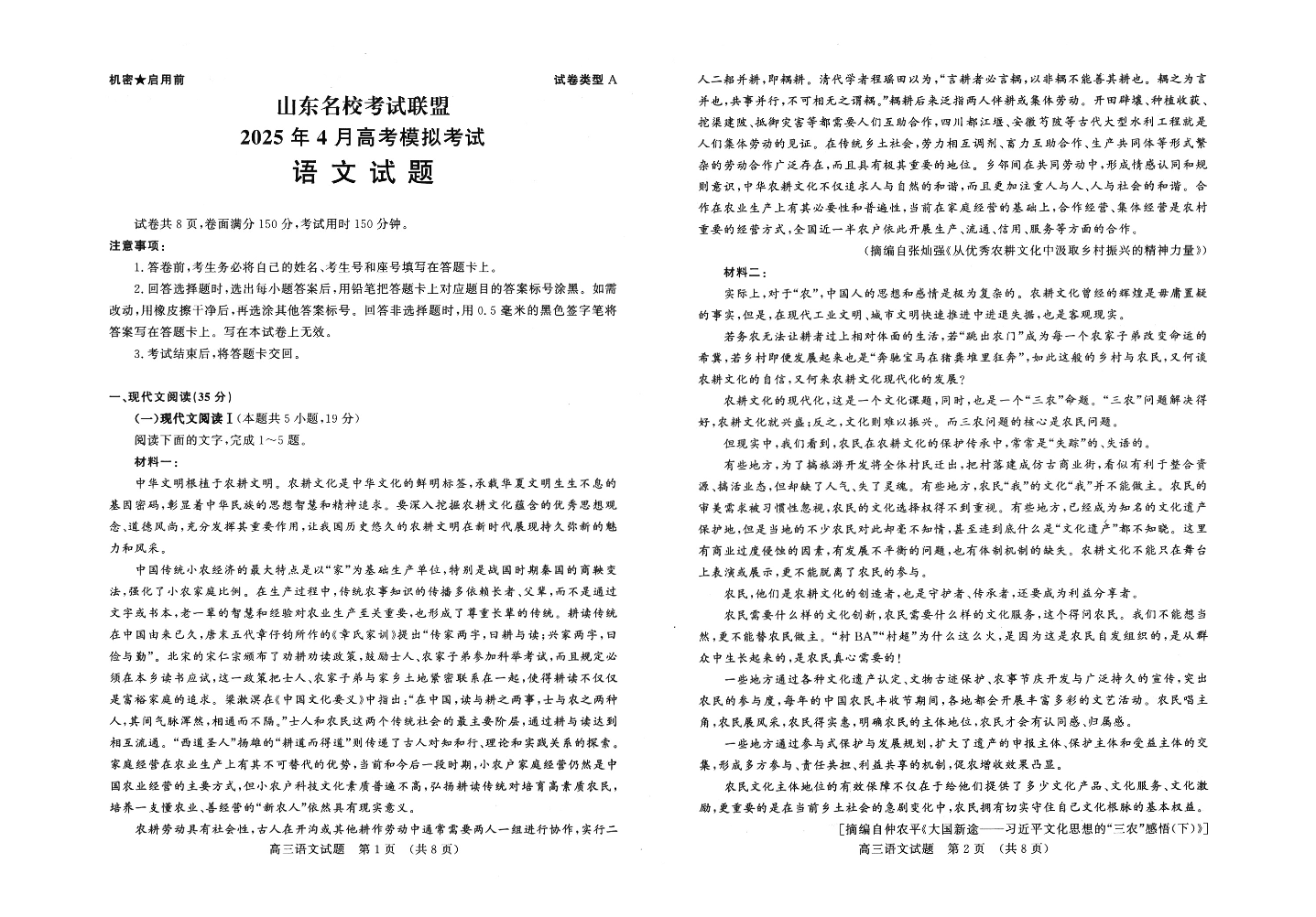 山东省名校考试联盟2024-2025学年学期4月高三模拟考试语文