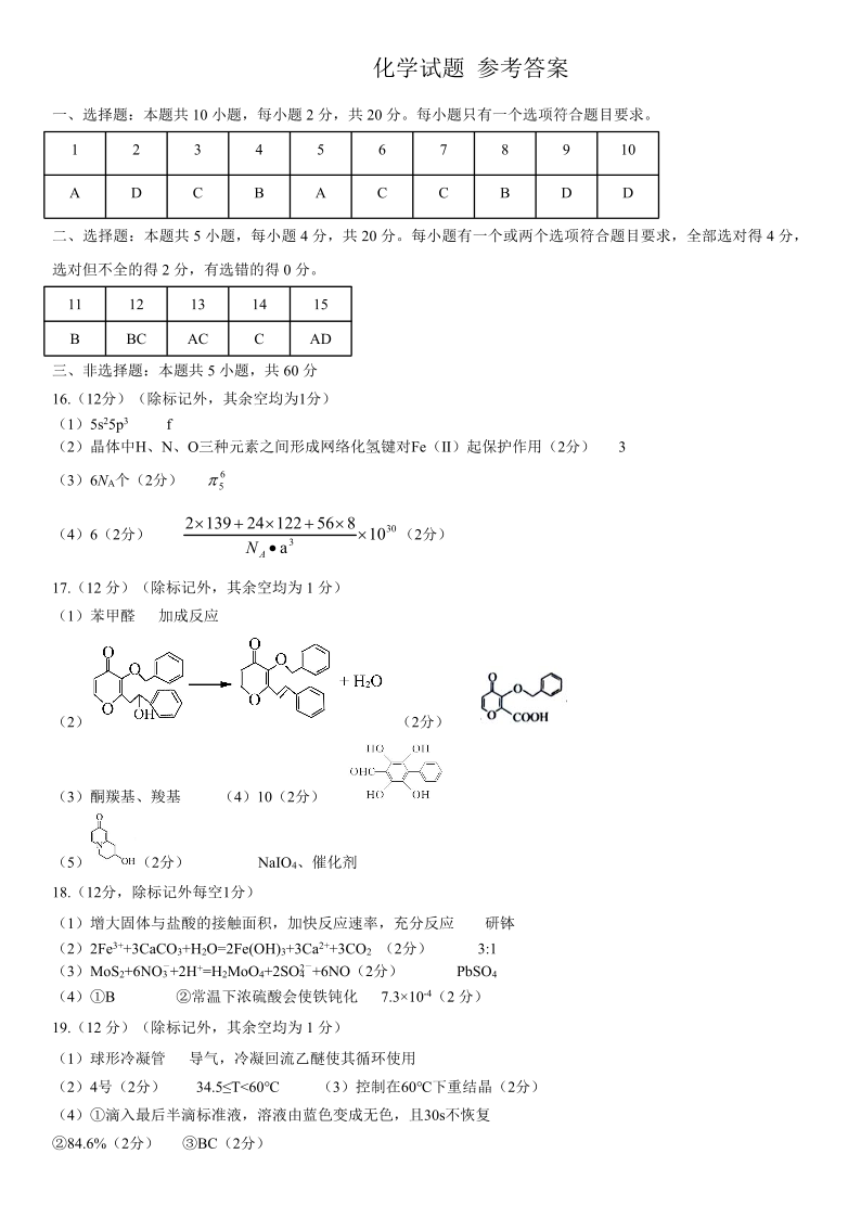 山东省名校考试联盟2024-2025学年学期4月高三模拟考试化学答案