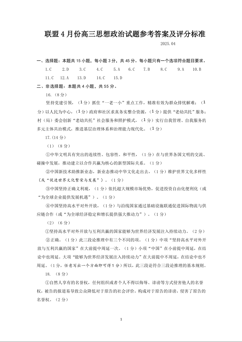 山东省名校考试联盟2024-2025学年学期4月高三模拟考试政治评分标准