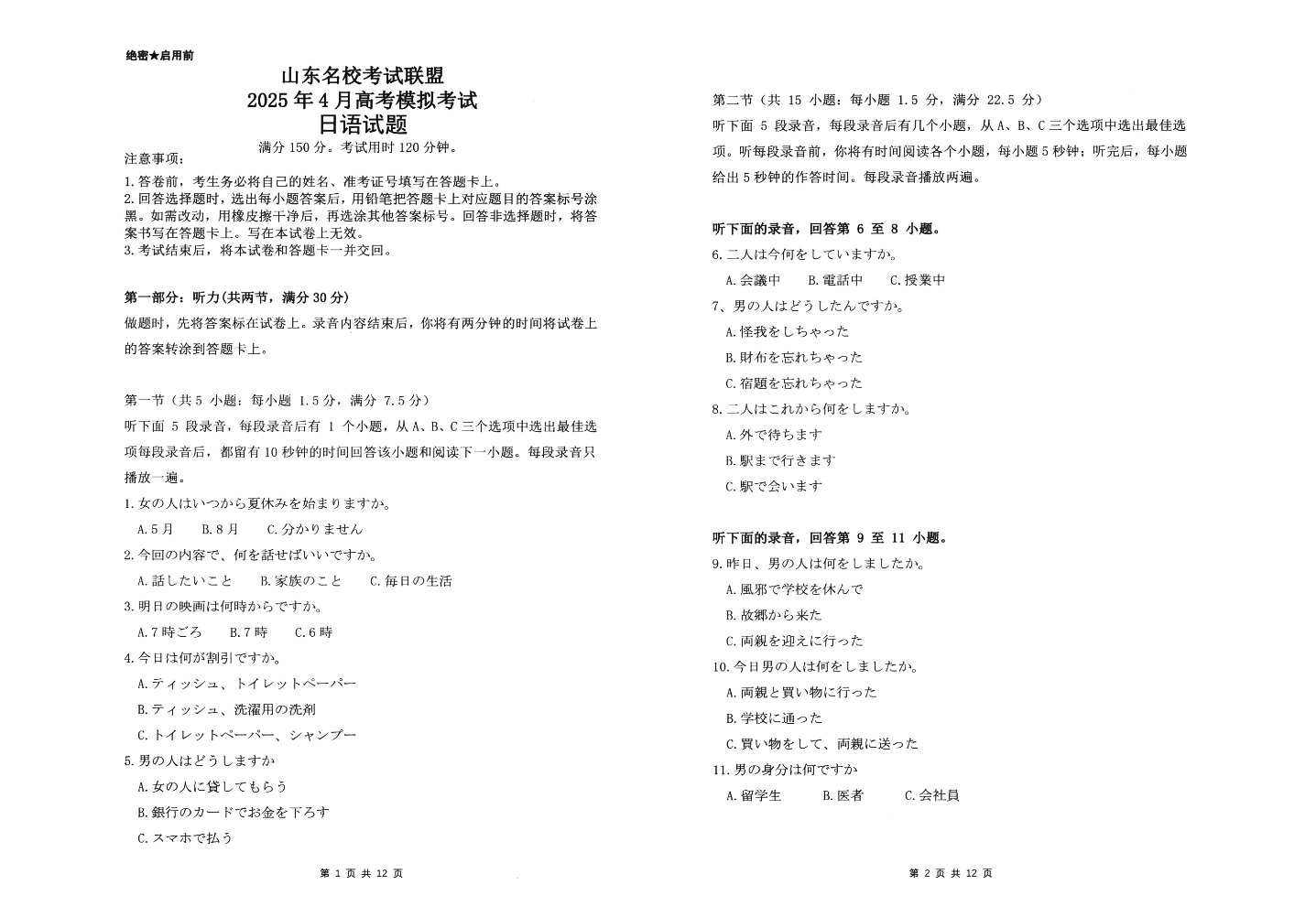 山东省名校考试联盟2024-2025学年学期4月高三模拟考试日语