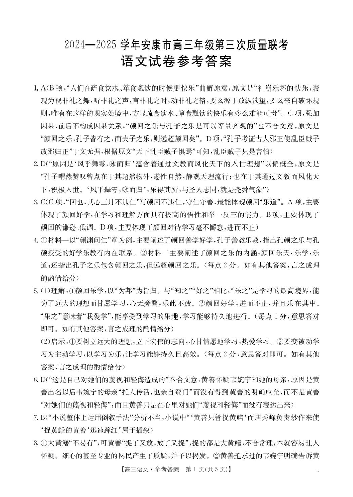 陕西省安康市2024-2025学年下学期高三第三次质量联考语文答案