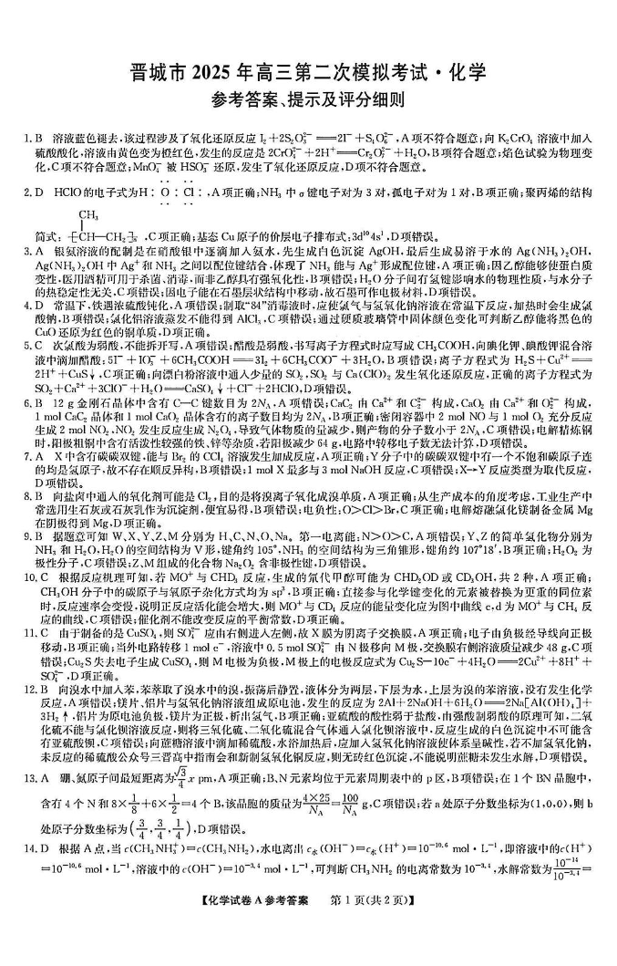山西省晋城市2024-2025学年下学期高三第二次模拟考试化学答案