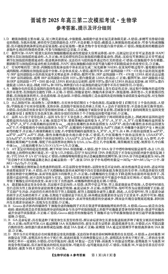 山西省晋城市2024-2025学年下学期高三第二次模拟考试生物答案