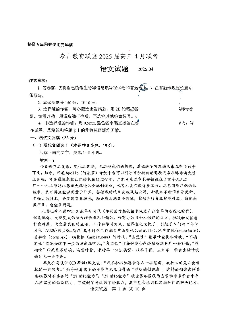 山东省泰山教育联盟2024-2025学年下学期4月高三联考语文