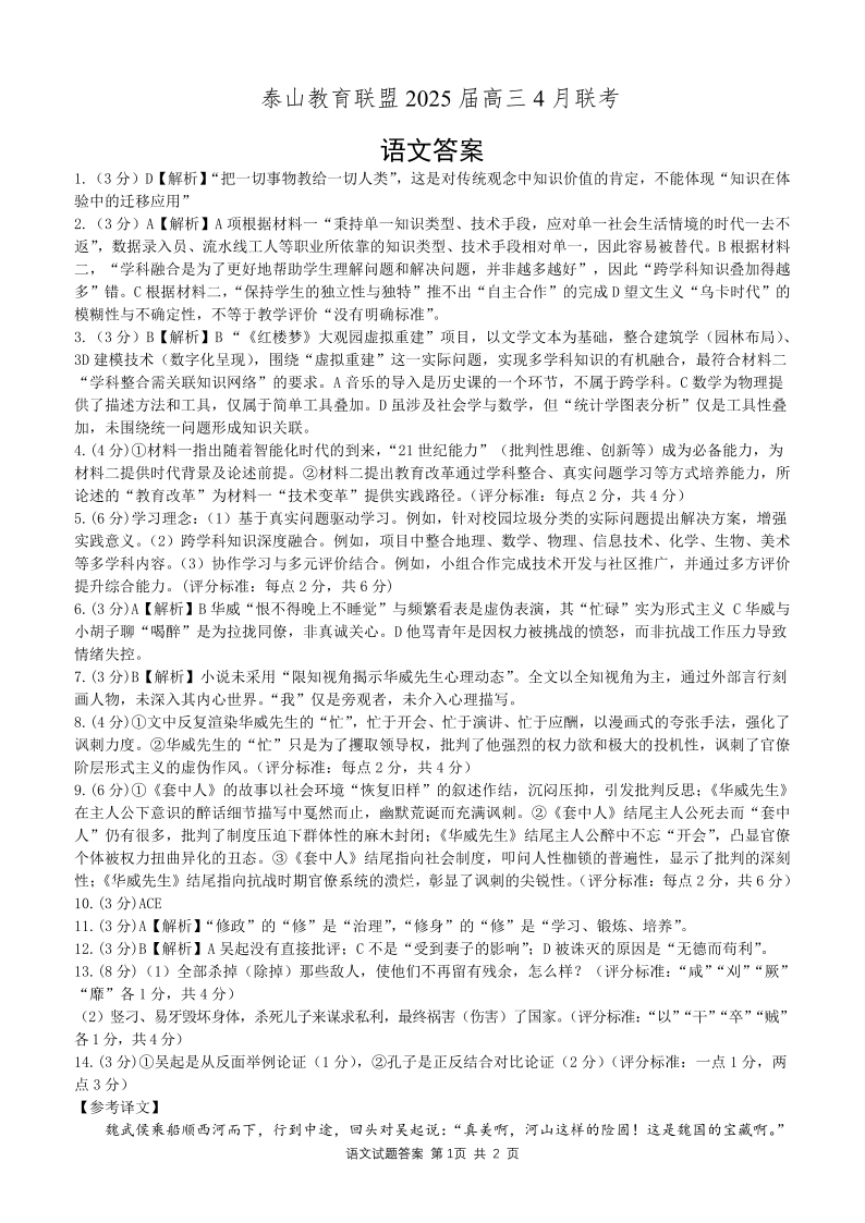 山东省泰山教育联盟2024-2025学年下学期4月高三联考语文答案