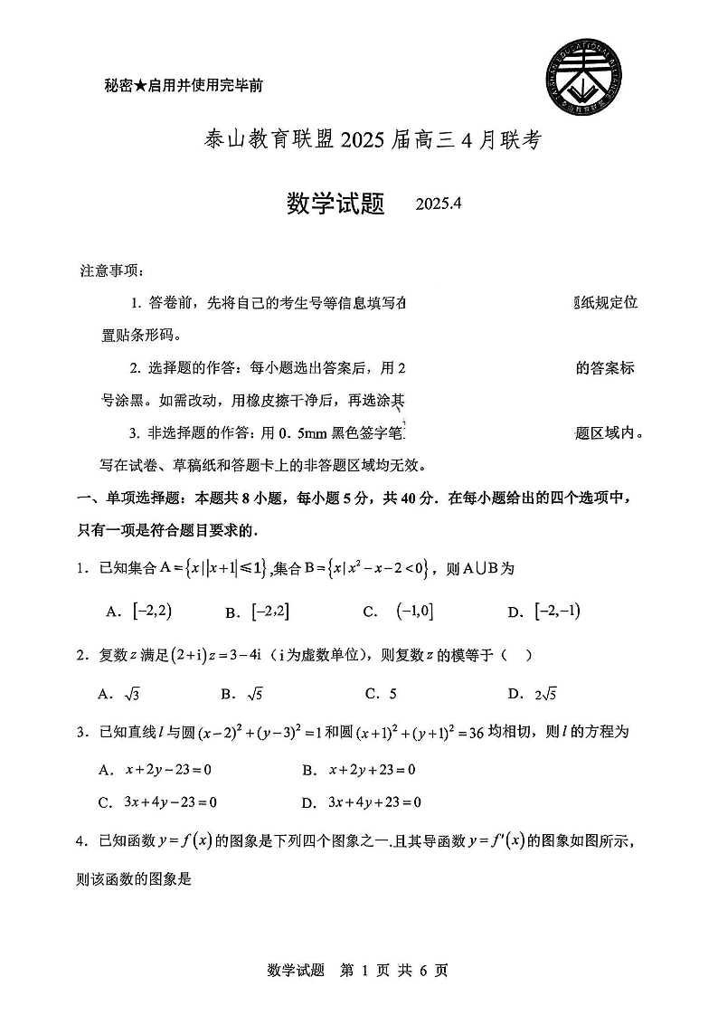 山东省泰山教育联盟2024-2025学年下学期4月高三联考数学