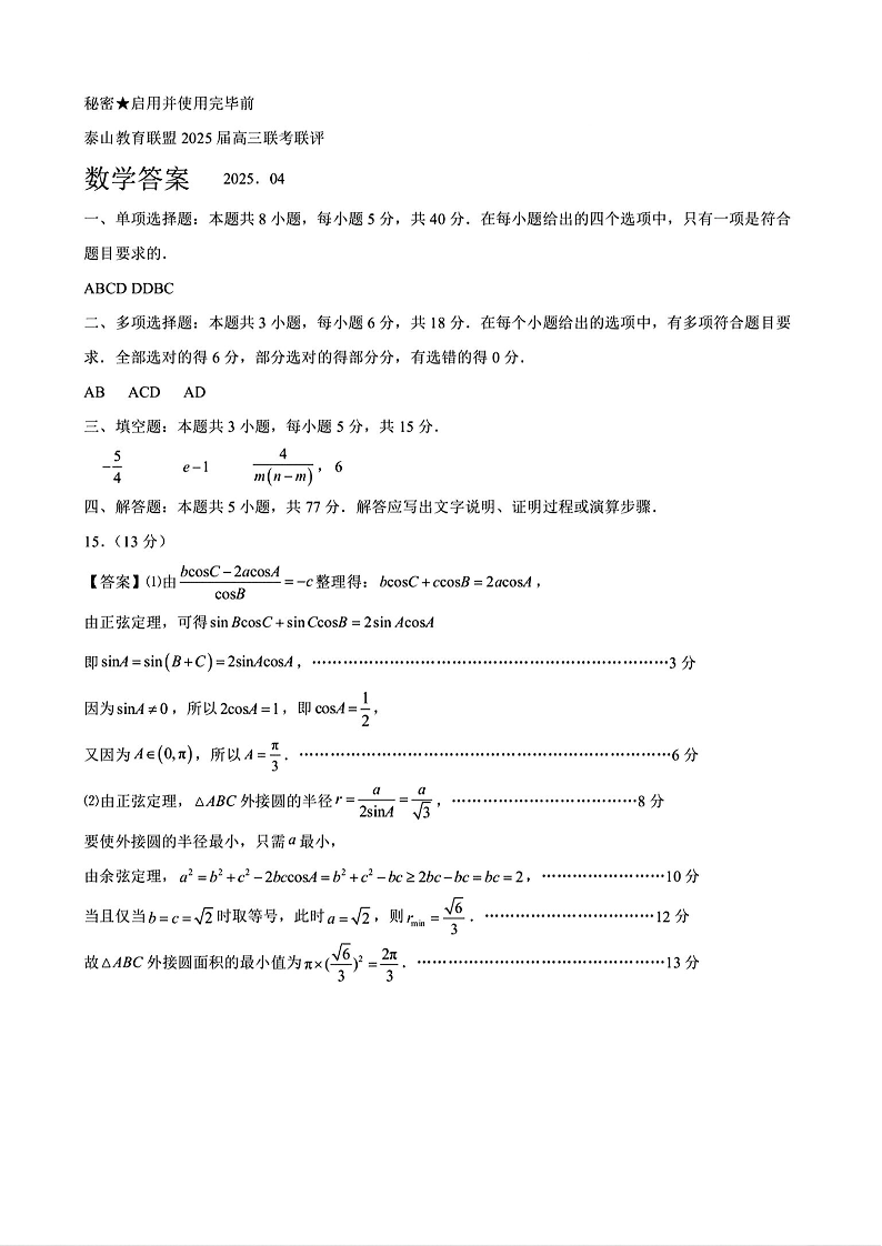 山东省泰山教育联盟2024-2025学年下学期4月高三联考数学答案