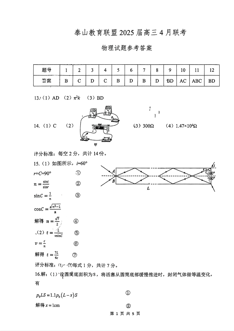 山东省泰山教育联盟2024-2025学年下学期4月高三联考物理答案