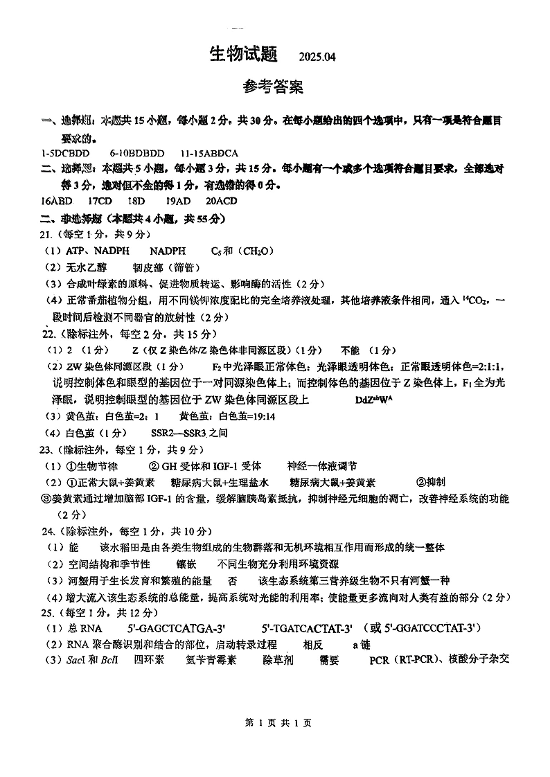 山东省泰山教育联盟2024-2025学年下学期4月高三联考生物答案