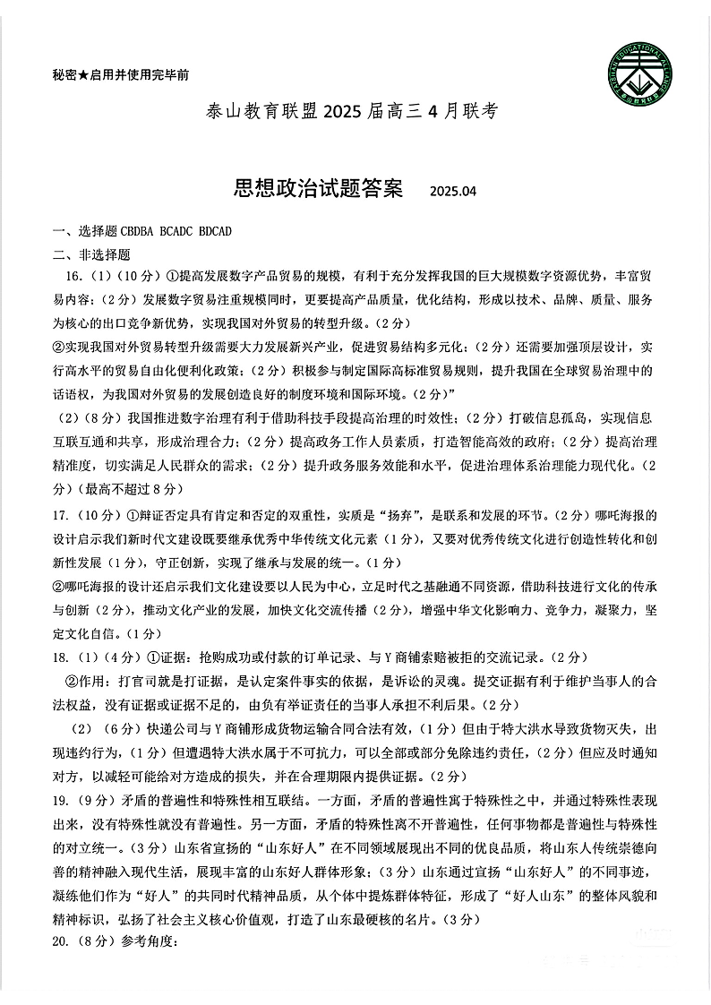 山东省泰山教育联盟2024-2025学年下学期4月高三联考政治答案
