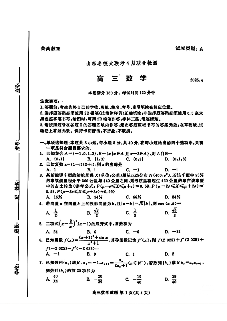 山东省部分高中2024-2025学年下学期4月高三联合检测数学+答案