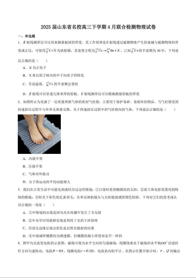 山东省部分高中2024-2025学年下学期4月高三联合检测物理+答案