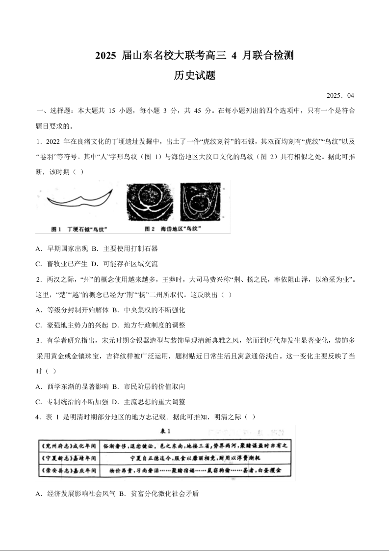 山东省部分高中2024-2025学年下学期4月高三联合检测历史+答案
