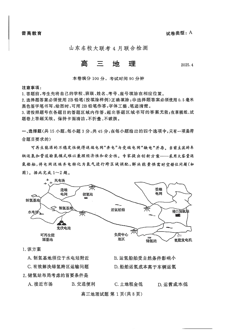 山东省部分高中2024-2025学年下学期4月高三联合检测地理
