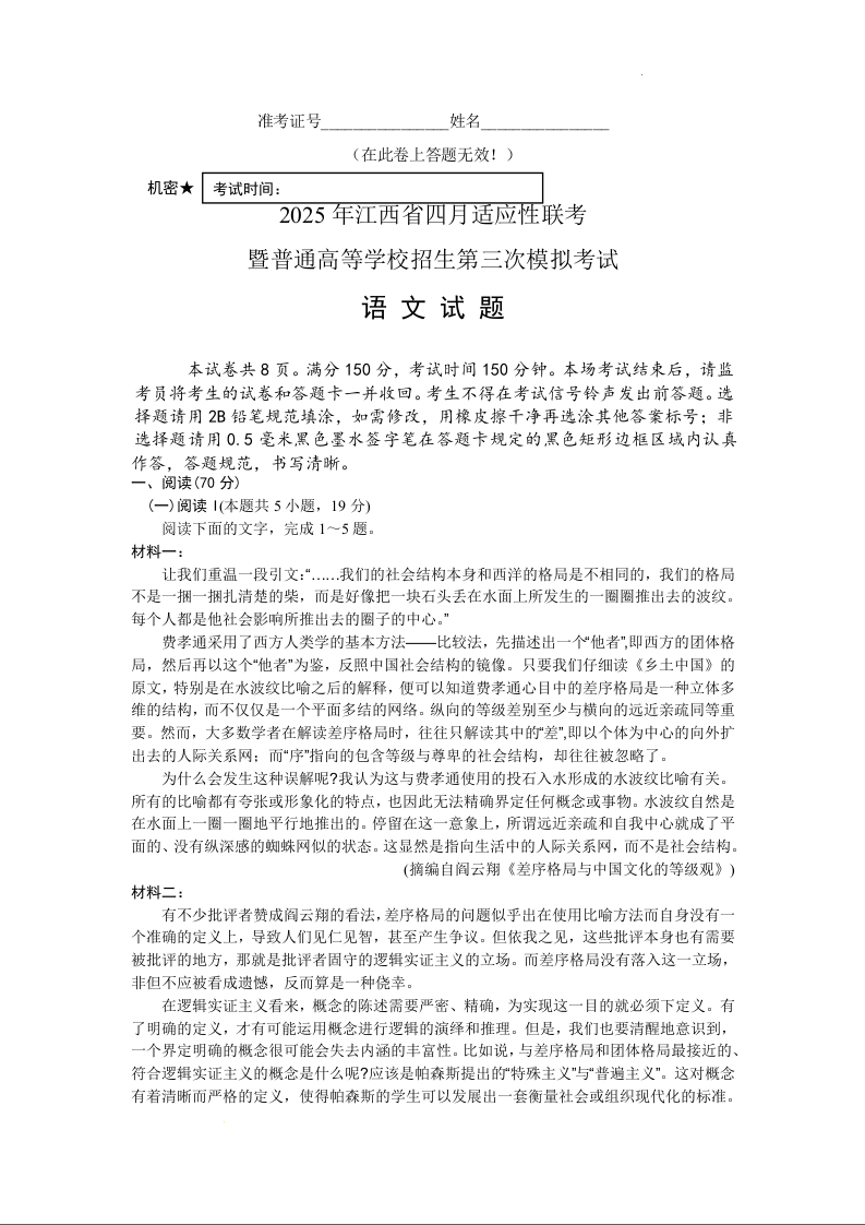 江西省区域高中2024-2025学年下学期四月高三适应性模拟语文