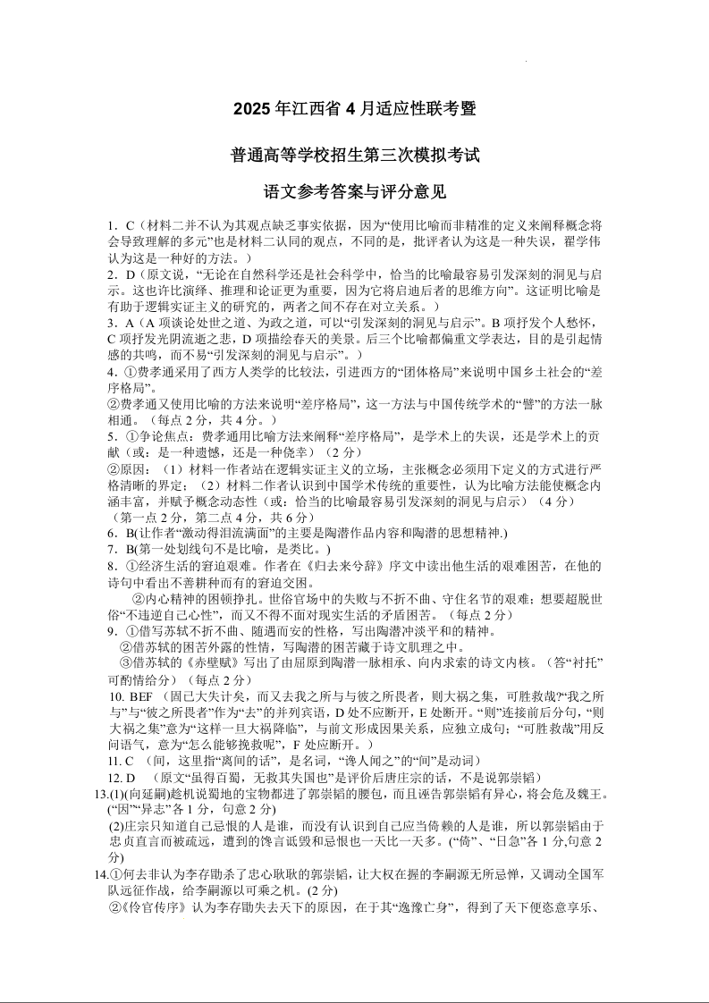 江西省区域高中2024-2025学年下学期四月高三适应性模拟语文答案