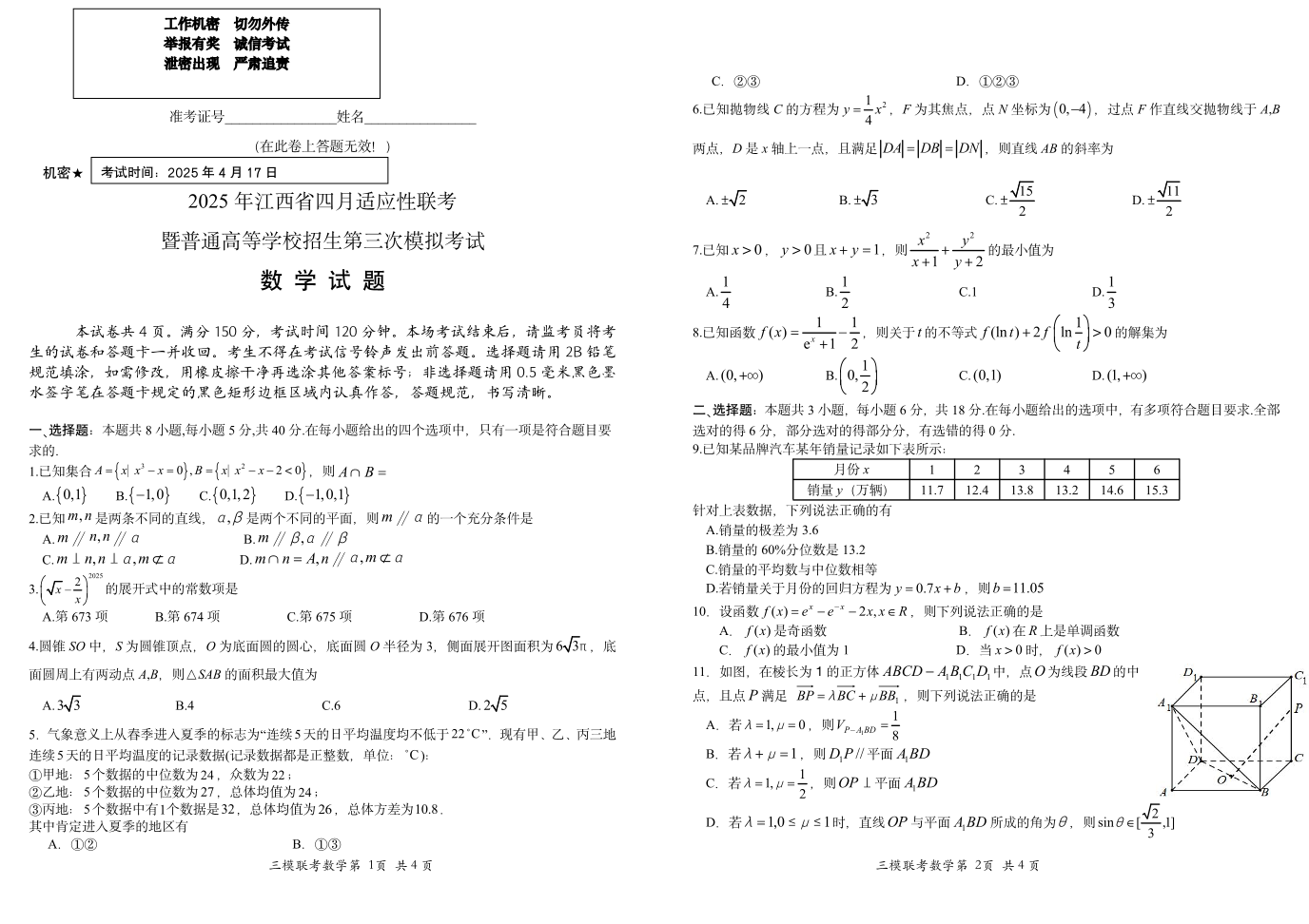 江西省区域高中2024-2025学年下学期四月高三适应性模拟数学