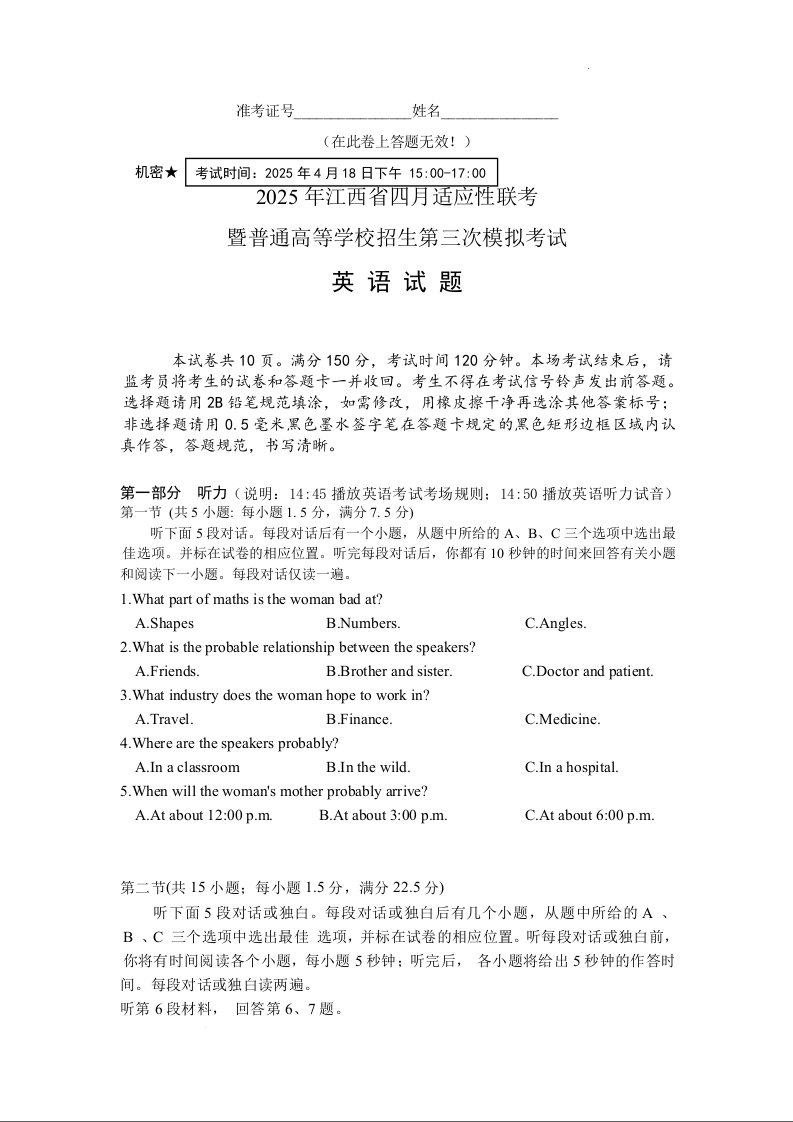 江西省区域高中2024-2025学年下学期四月高三适应性模拟英语+答案