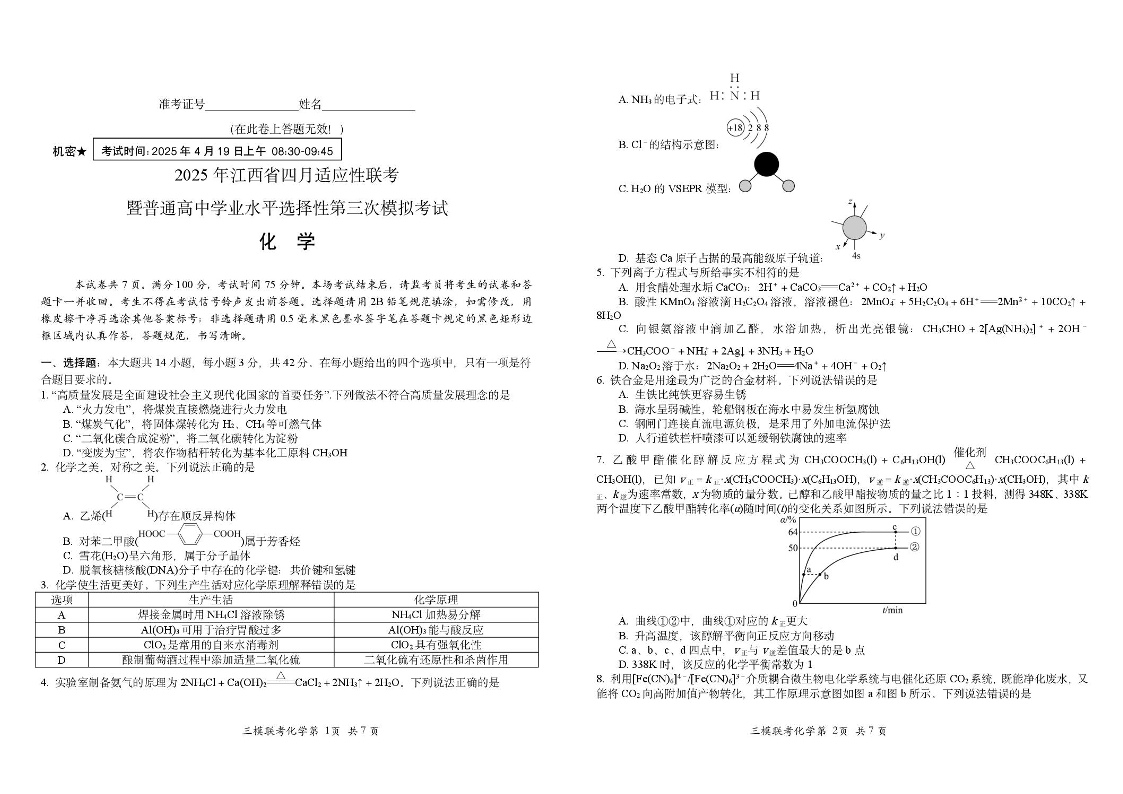 江西省区域高中2024-2025学年下学期四月高三适应性模拟化学+答案