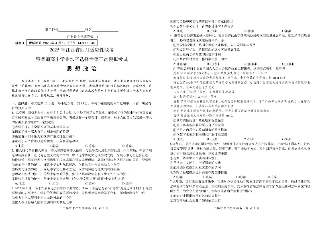 江西省区域高中2024-2025学年下学期四月高三适应性模拟政治+答案