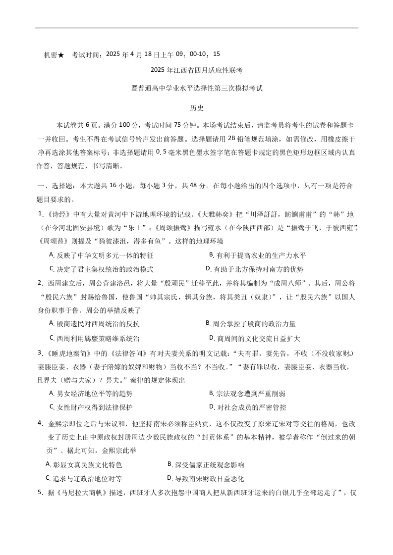 江西省区域高中2024-2025学年下学期四月高三适应性模拟历史+答案
