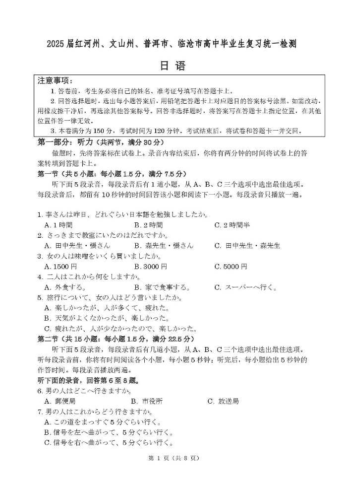 云南省红河、文山、普洱、临沧四市州2024-2025学年高三三模日语