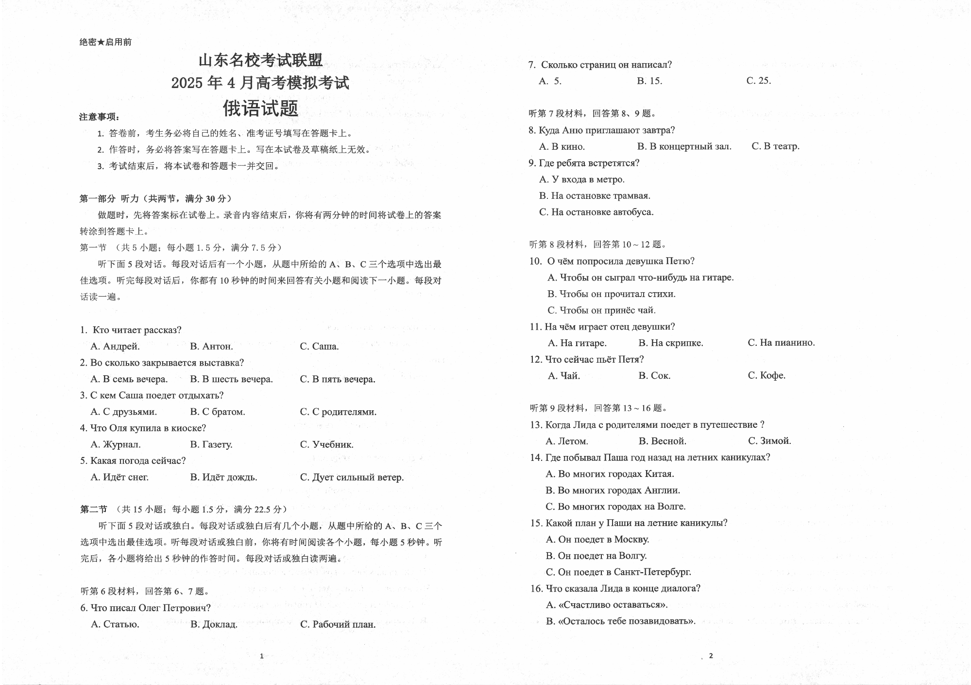 山东省名校考试联盟2024-2025学年学期4月高三模拟考试俄语