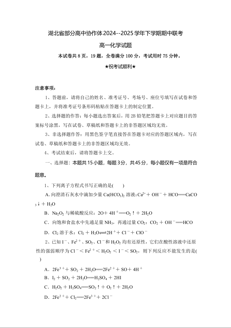 湖北省部分高中协作体2024-2025学年下学期4月高一期中联考化学+答案