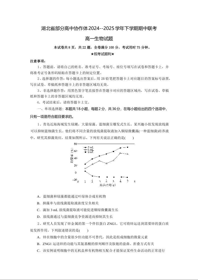 湖北省部分高中协作体2024-2025学年下学期4月高一期中联考生物