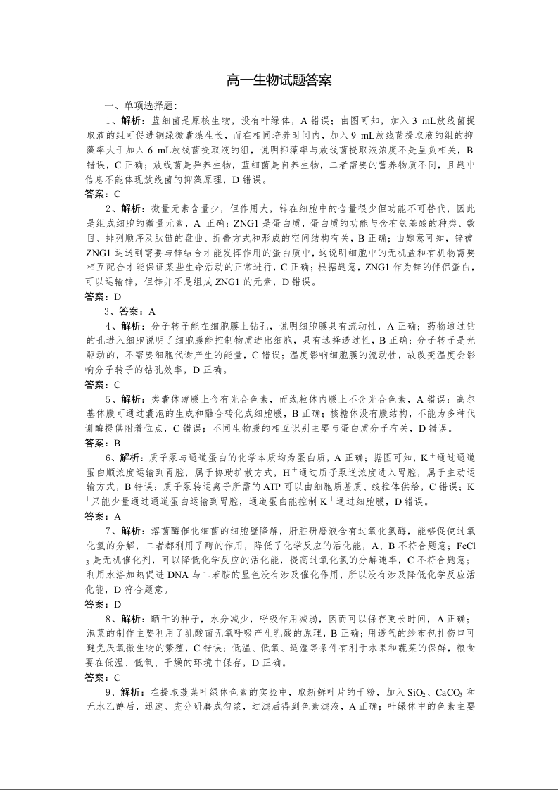 湖北省部分高中协作体2024-2025学年下学期4月高一期中联考生物答案